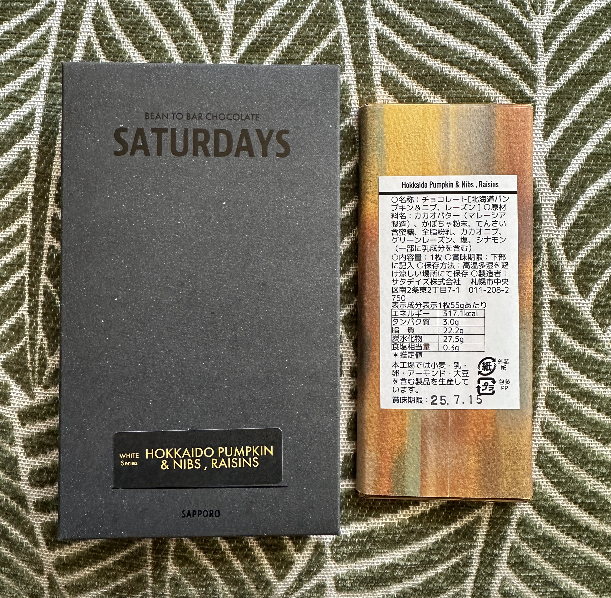 Ingredients: cocao butter made in Malaysia, pumpkin powder, beet sugar, whole milk powder, cocoa nibs, green raisins, salt, cinnamon. Manufactured in a facility that processes wheat, milk, eggs, almonds, and soybeans. (Check the translation if you have allergy concerns.) Best before date in 2025, but the bar is still safe to eat and perfectly delicious.