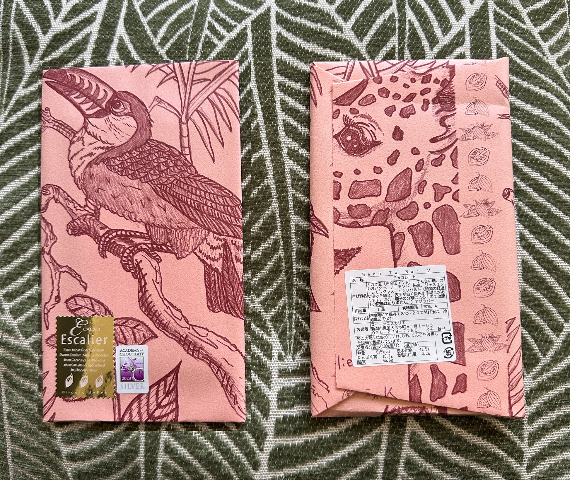 Ingredients: cacao beans from India, beet sugar, cocoa butter, almonds, milk powder, jasmine, lemongrass, pink salt. Refrigerate after opening. Manufactured in a facility that uses microwave ovens, bananas, peaches, and apples. (Double check translation if you have allergy concerns.)